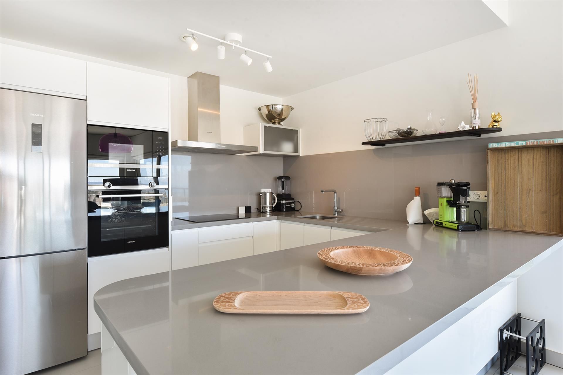 Luxe open keuken met keramische kookplaat, afzuigkap, oven, magnetron, koelkast / vriezer, vaatwasser, koffiezetapparaat, waterkoker, broodrooster en mixer.