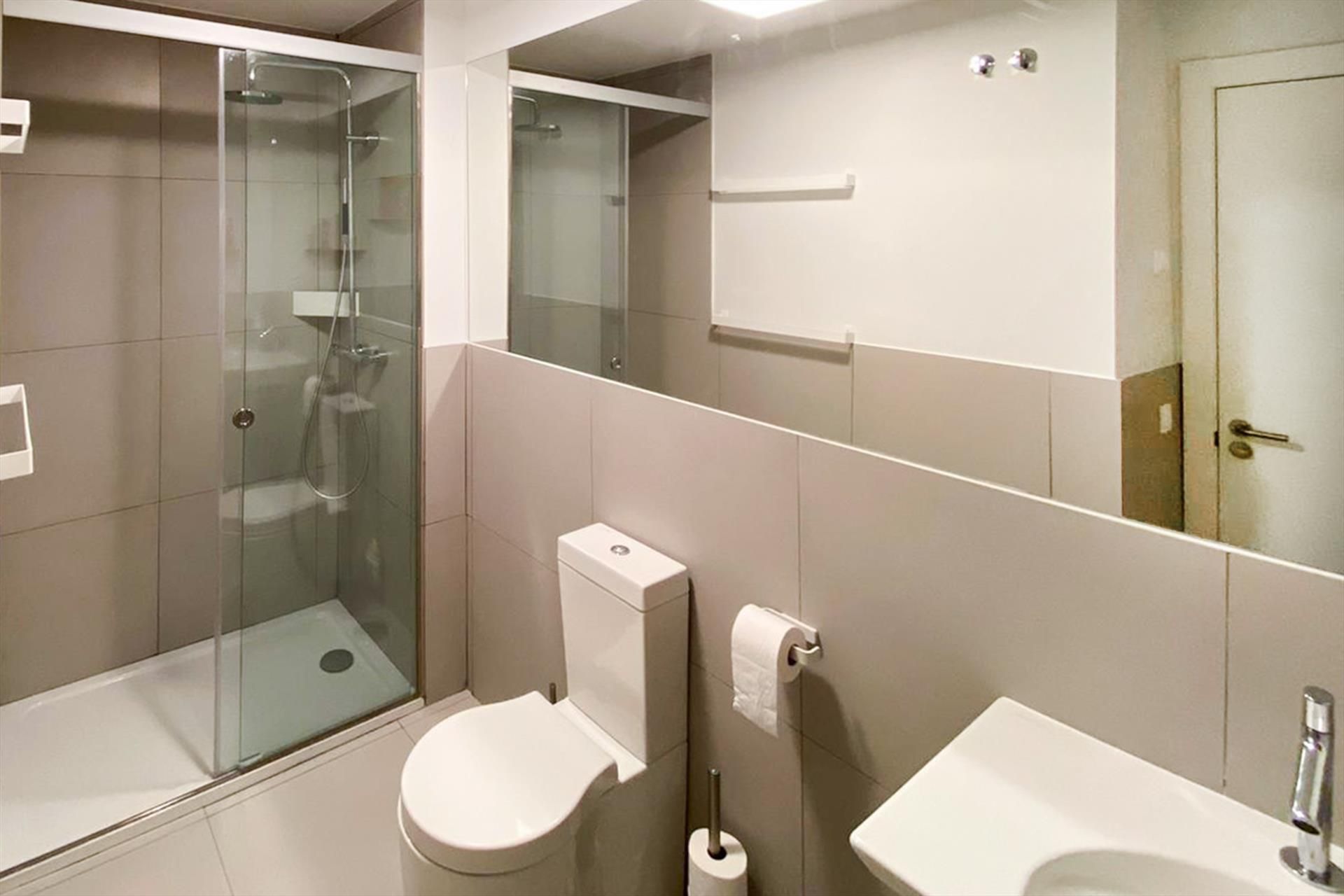 Drie badkamers. De hoofdbadkamer heeft een ligbad met douche in het bad, een wandmeubel met twee wastafels, een toilet en een föhn. De tweede badkamer heeft een ruime inloopdouche, een wastafel en een toilet. De derde badkamer heeft eveneens een inloopdouche, wastafel en toilet.