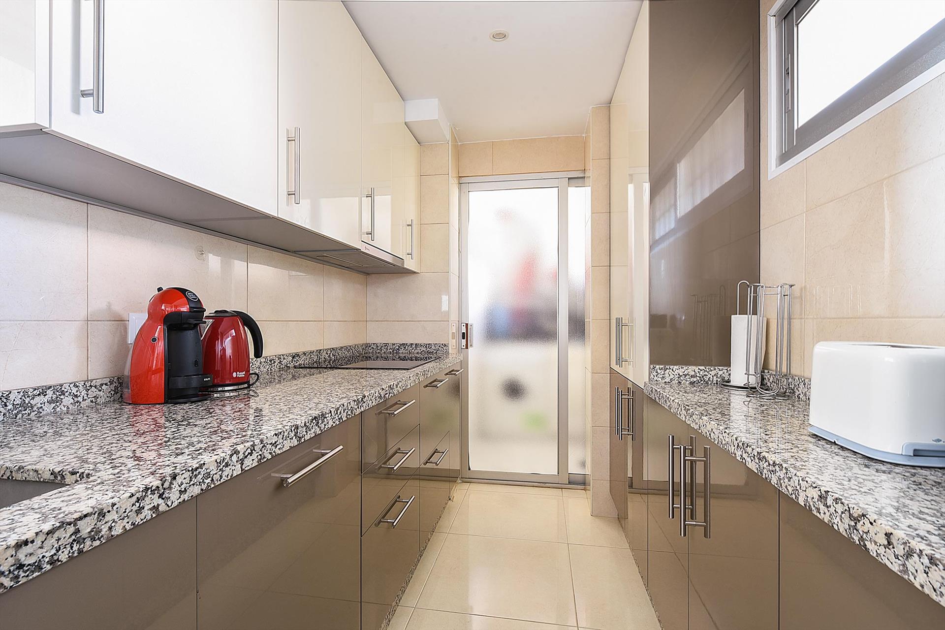 Keuken met ceramische kookplaat, afzuigkap, oven, magnetron, koelkast met vriesvak, vaatwasser, koffiemachine, waterkoker en broodtoaster.