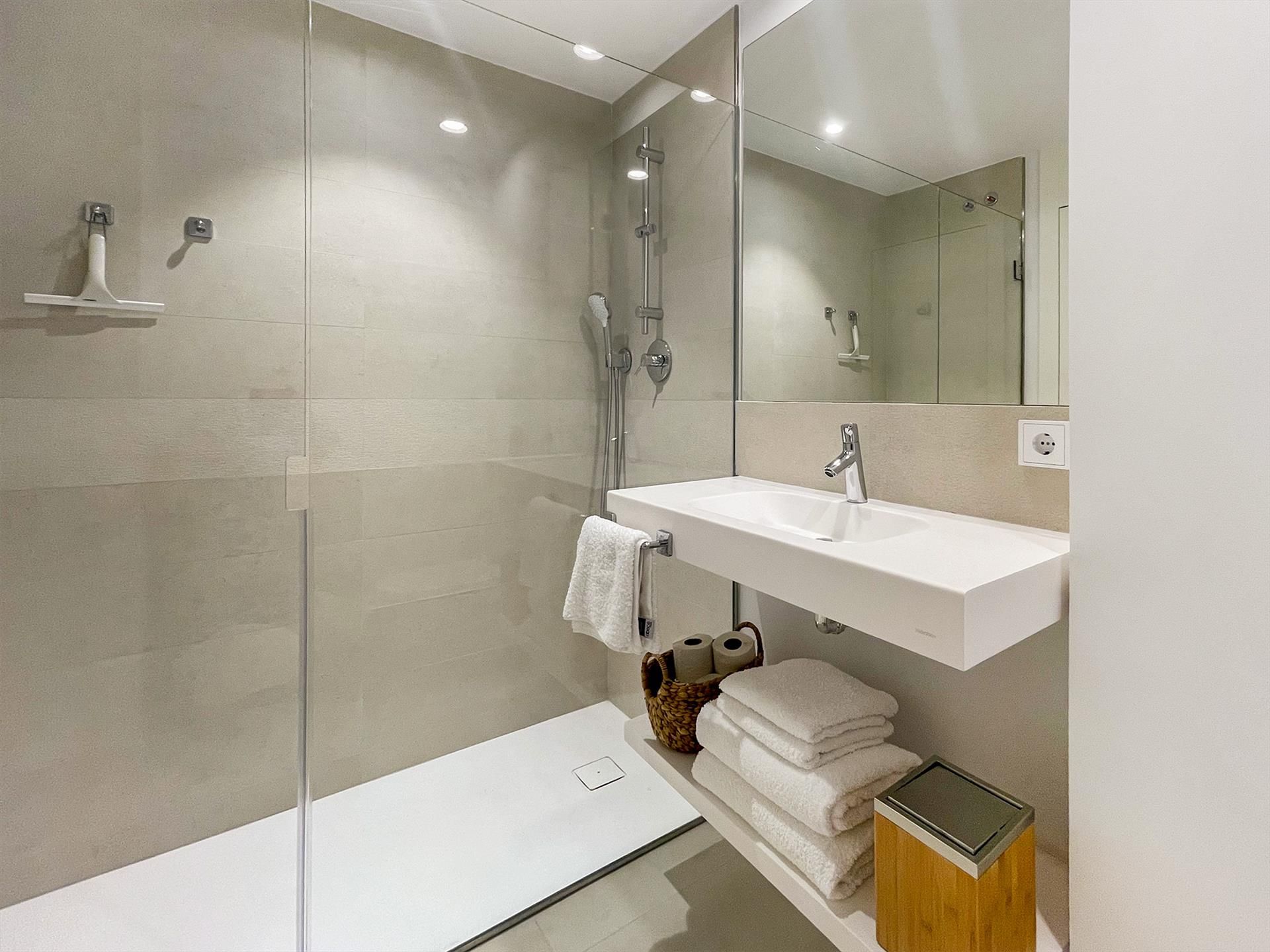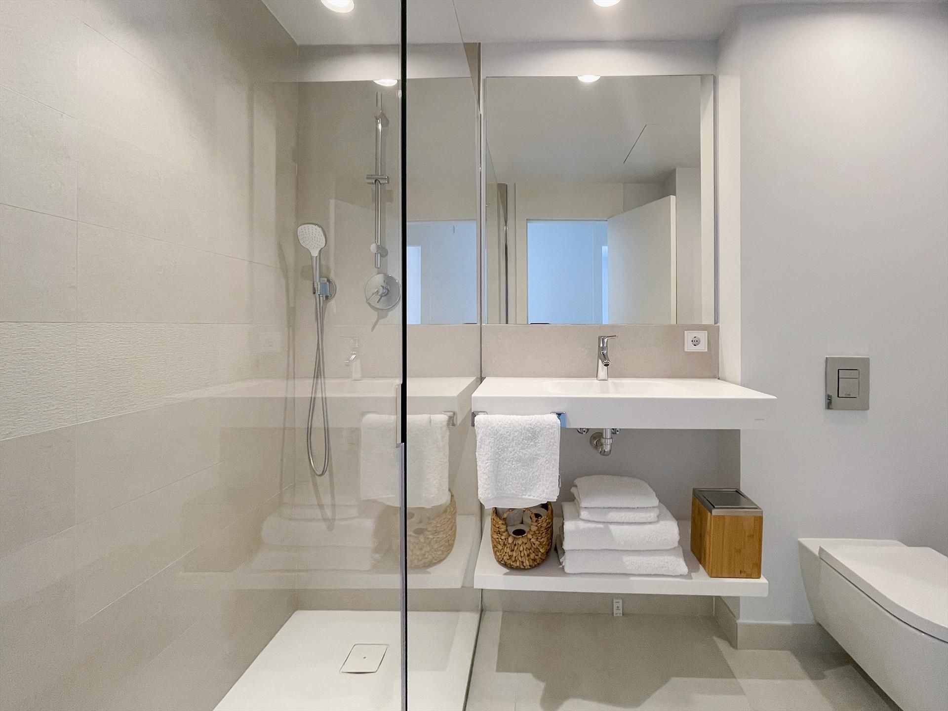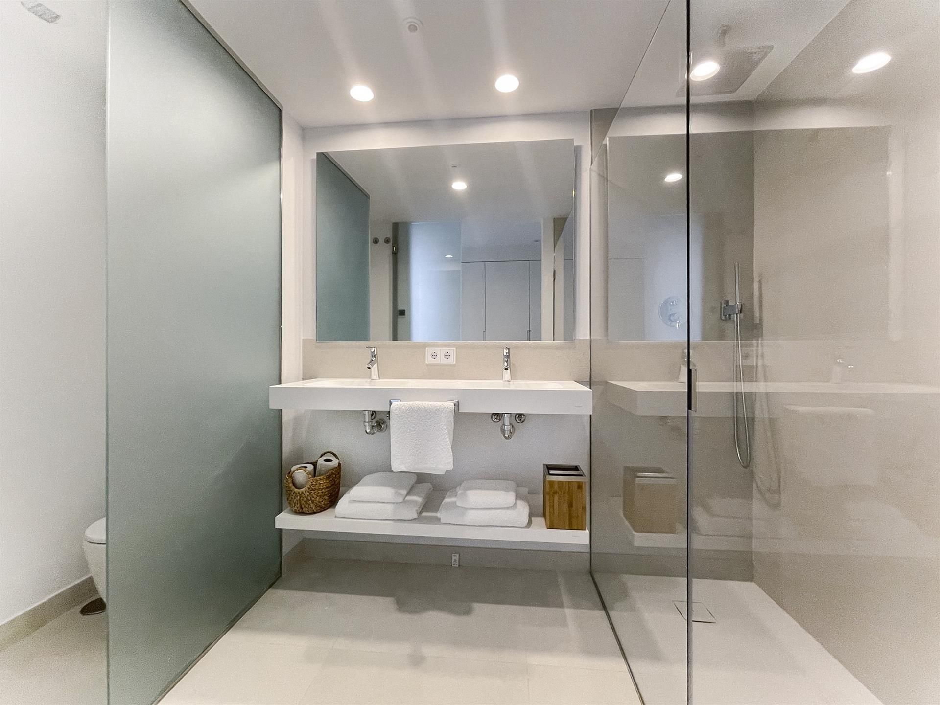 De ensuite badkamer en heeft een dubbele wastafel, een ruime inloopdouche, een afsluitbaar toilet en een föhn. De tweede badkamer heefft een wastafel, en eveneens een ruime inloopdouche en een toilet