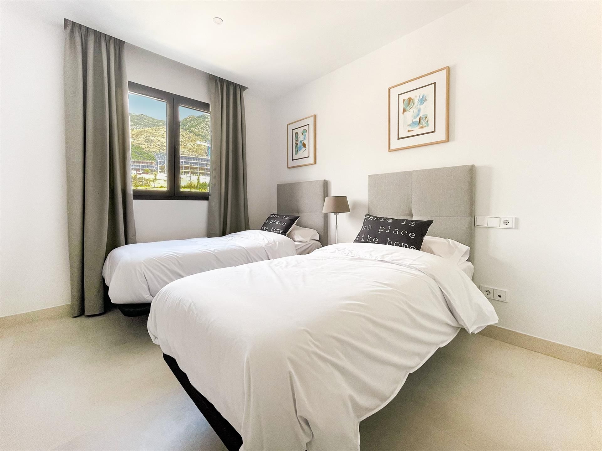 De hoofdslaapkamer heeft een tweepersoonsbed van 180x200 met goede matras, een televisie, airco en een badkamer ensuite. De tweede slaapkamer beschikt over airco en 2 eenpersoonsbedden van 90x200 met goede matrassen