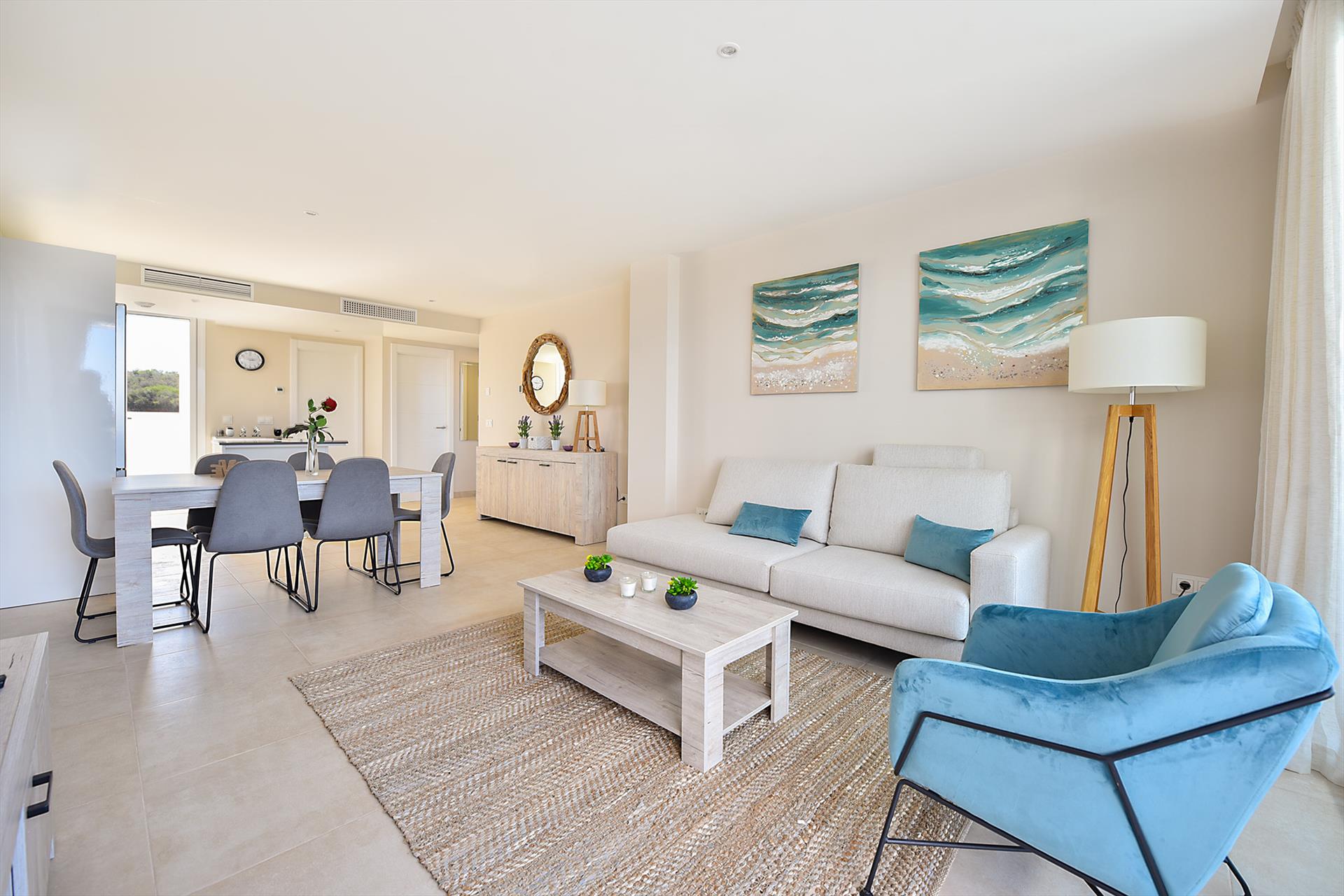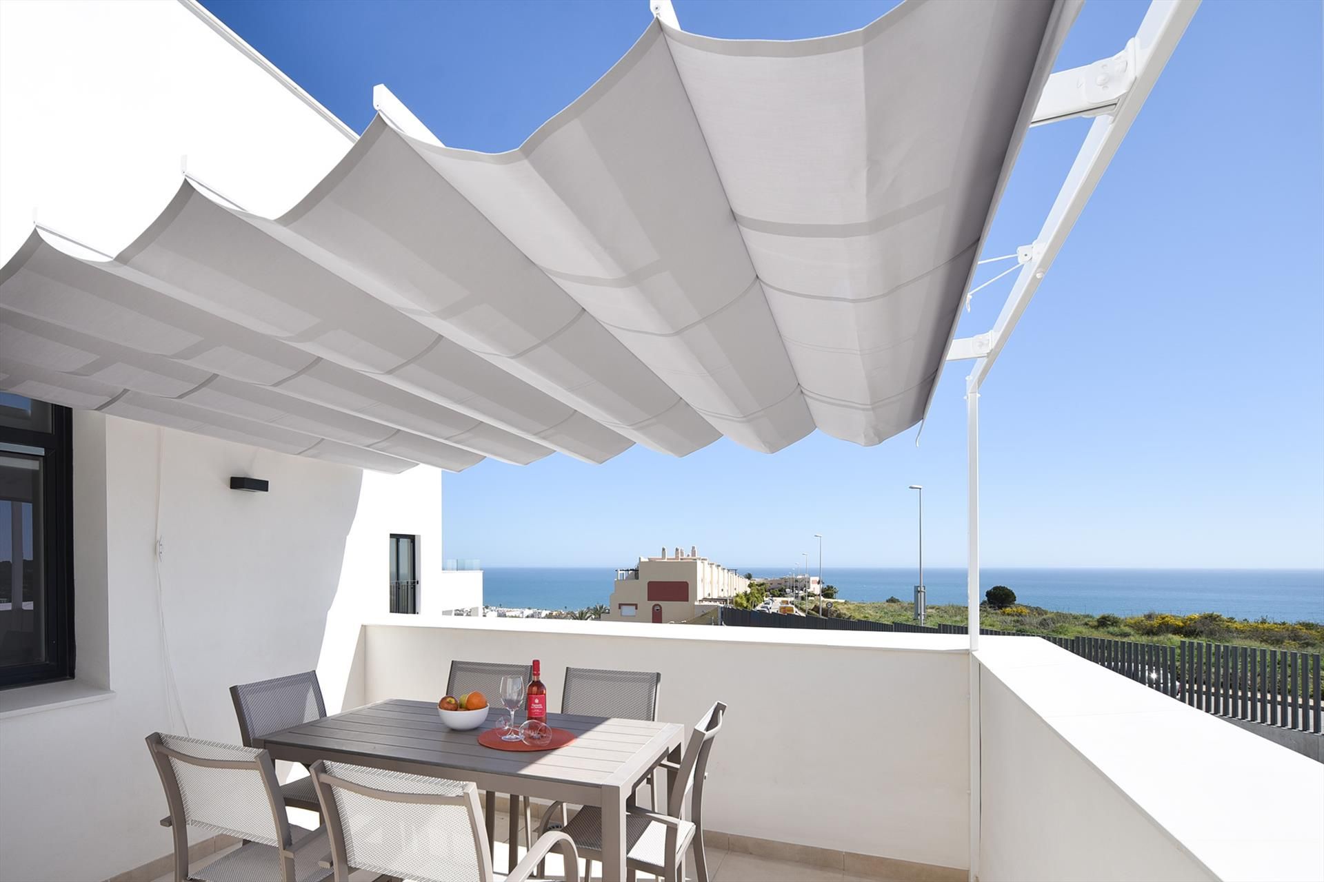 Het appartement is modern ingericht en van alle comfort voorzien. Het beschikt over een woonkamer met zithoek, eethoek en een moderne open keuken voorzien van alle benodigde apparatuur, 3 slaapkamers en 2 badkamers. Het appartement heeft 2 terrassen, 1 bij de woonkamer op het noordoosten en 1 op het zuidwesten bij de keuken zodat er altijd een plekje is in de zon, of juist in de schaduw. Het terras bij de woonkamer heeft uitzicht op de vallei en de bergen van Mijas, en het terras bij de keuken heeft uitzicht op zee.