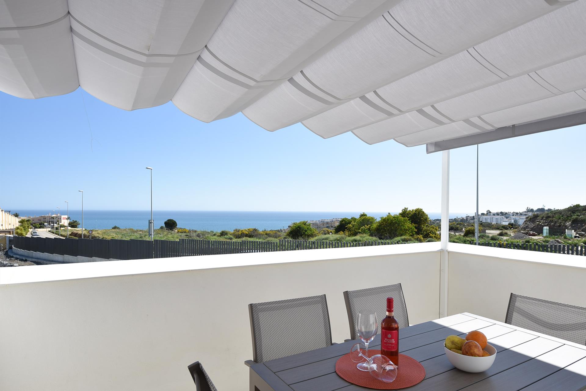 Het terras bij de woonkamer heeft uitzicht op de vallei en de bergen van Mijas. Dit is de ideale plek voor een heerlijk ontbijt aan de eettafel met 6 stoelen of om lekker te relaxen met een boek op de hoek-loungebank. Er is ook een elektrische Weber barbecue voor buitengebruik. En 2 ligbedden.