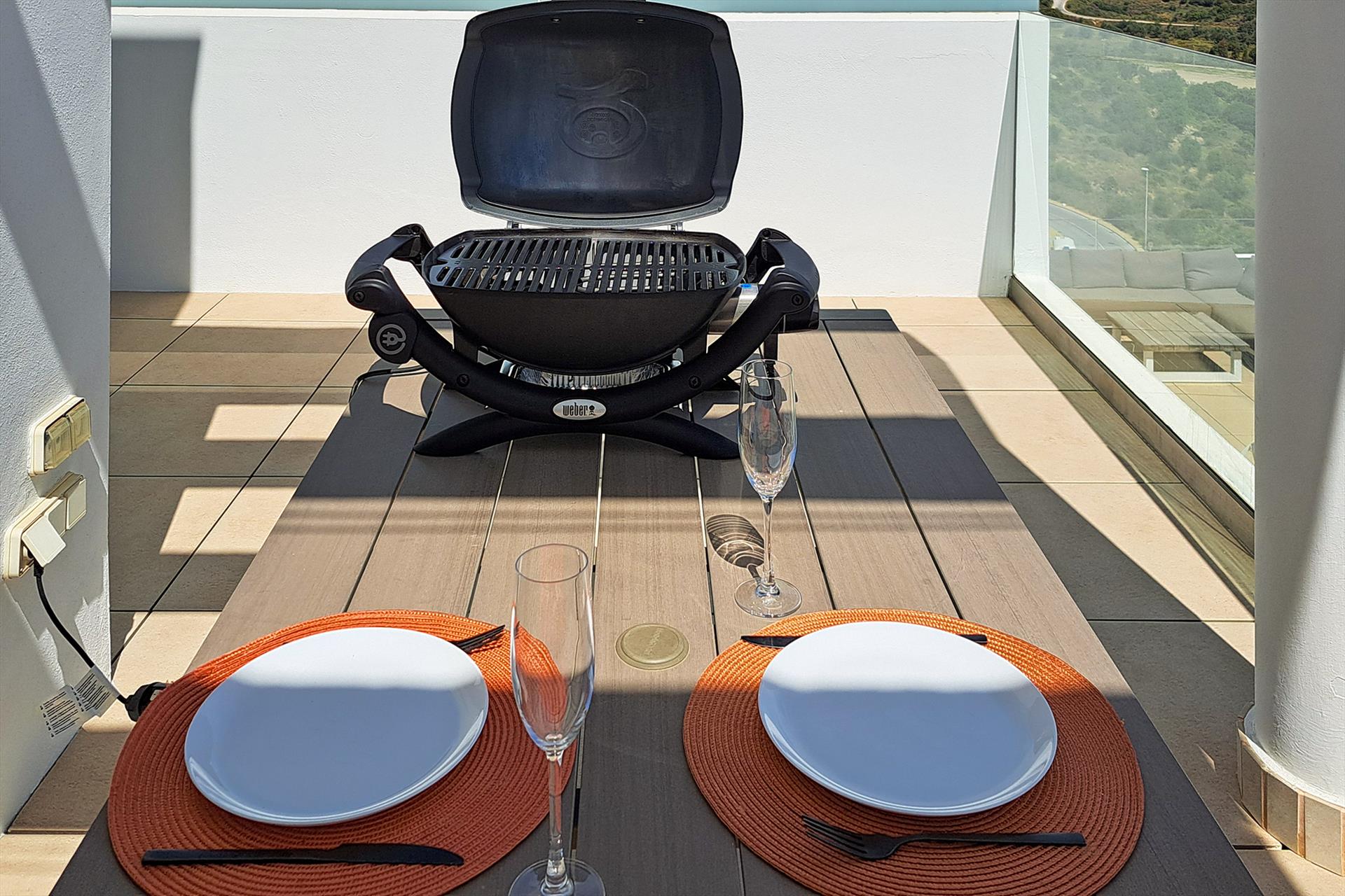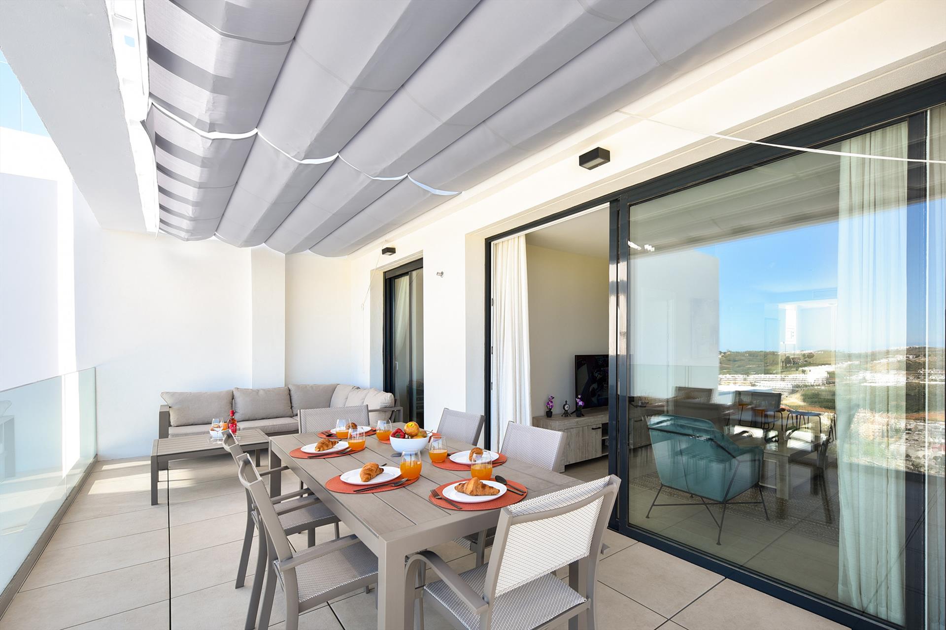 Het terras bij de woonkamer heeft uitzicht op de vallei en de bergen van Mijas. Dit is de ideale plek voor een heerlijk ontbijt aan de eettafel met 6 stoelen of om lekker te relaxen met een boek op de hoek-loungebank. Er is ook een elektrische Weber barbecue voor buitengebruik. En 2 ligbedden.