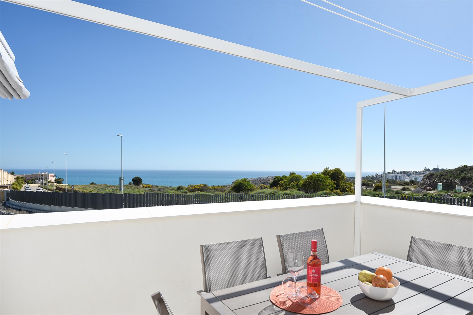 Het appartement is modern ingericht en van alle comfort voorzien. Het beschikt over een woonkamer met zithoek, eethoek en een moderne open keuken voorzien van alle benodigde apparatuur, 3 slaapkamers en 2 badkamers. Het appartement heeft 2 terrassen, 1 bij de woonkamer op het noordoosten en 1 op het zuidwesten bij de keuken zodat er altijd een plekje is in de zon, of juist in de schaduw. Het terras bij de woonkamer heeft uitzicht op de vallei en de bergen van Mijas, en het terras bij de keuken heeft uitzicht op zee.