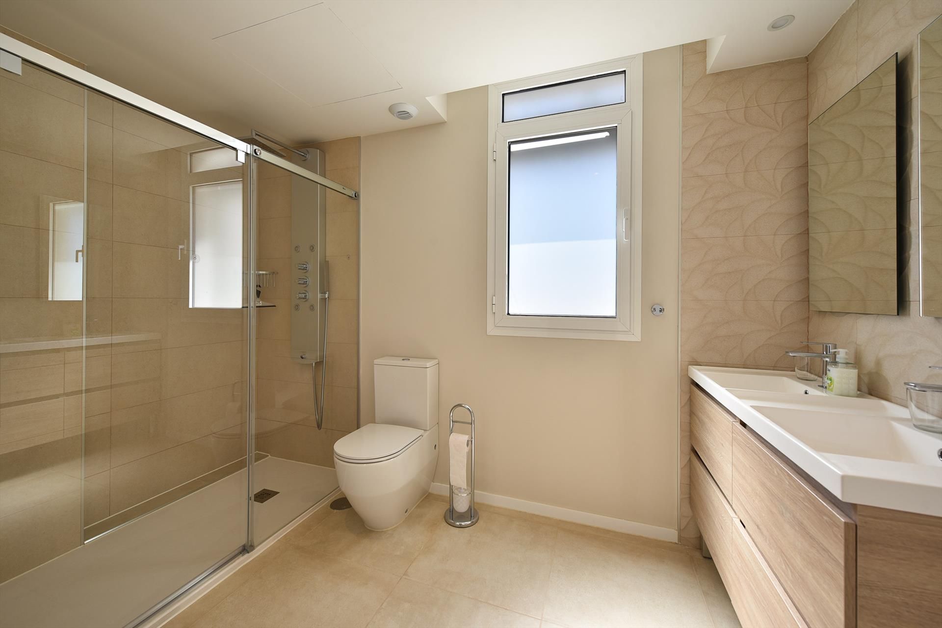 De tweede badkamer heeft een douche, een dubbele wastafel en toilet.