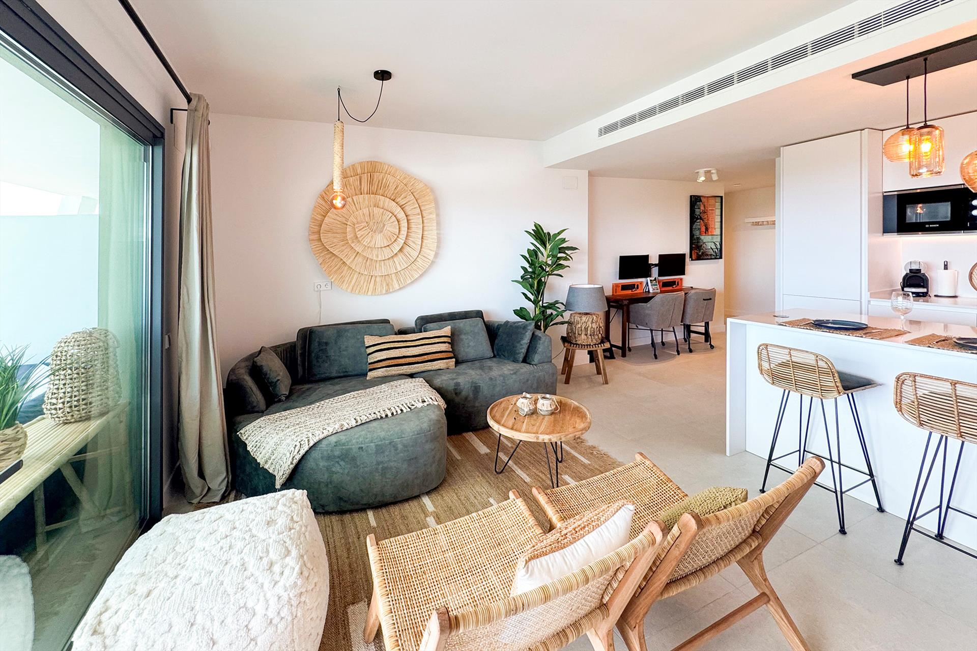 - woonkamer met loungebank en twee stoelen, een bureau/werkplek met twee beeldschermen, een open keuken met eetbar en vier barkstoelen en een schuifpui naar het terras