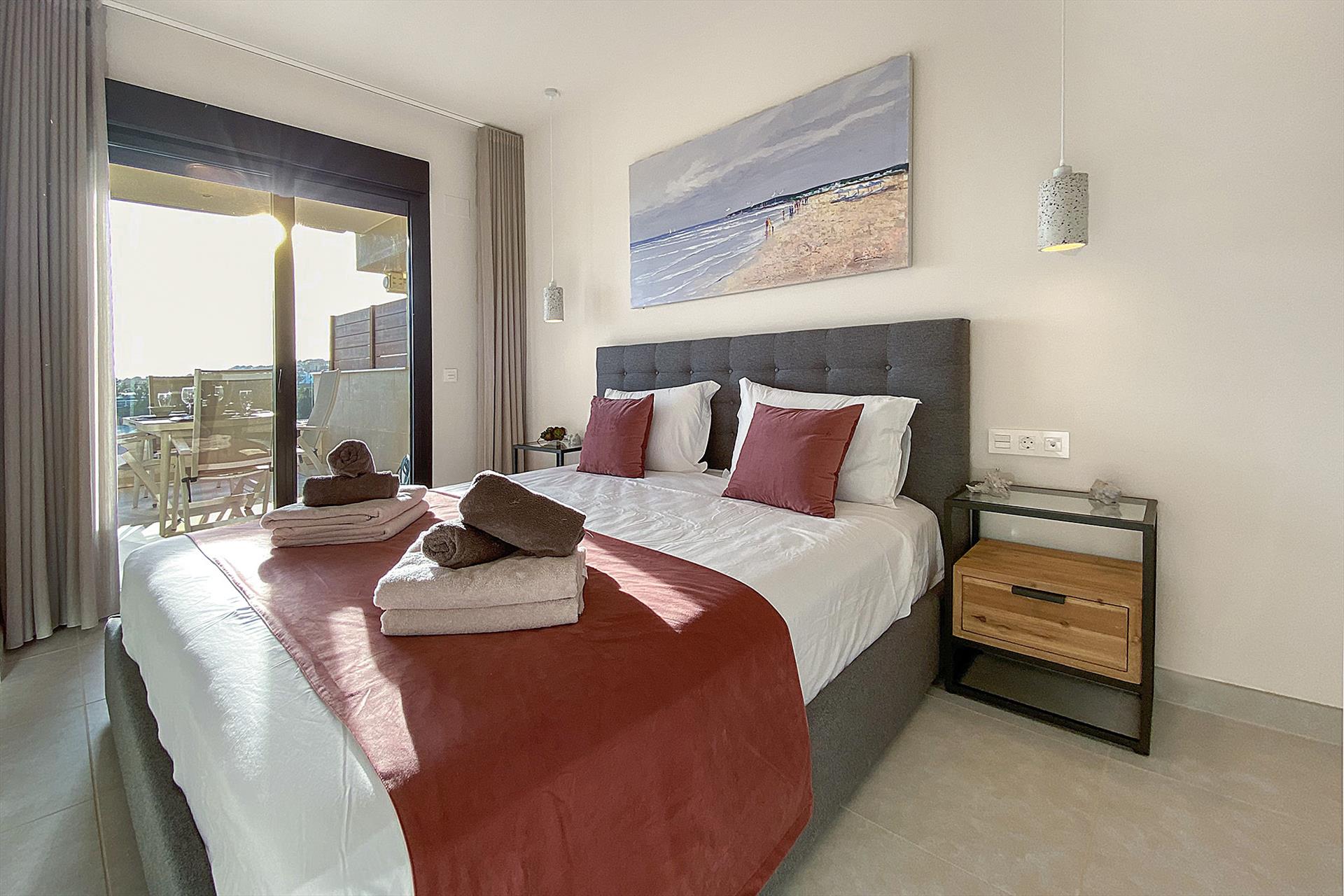 Aansluitend aan de woonkamer bevindt zich de ruime hoofdslaapkamer met en-suite badkamer, een inloopkast en een schuifpui naar het terras met een prachtig uitzicht op de omgeving en de zee. De 2e slaapkamer heeft eveneens een eigen badkamer met inloopdouche.