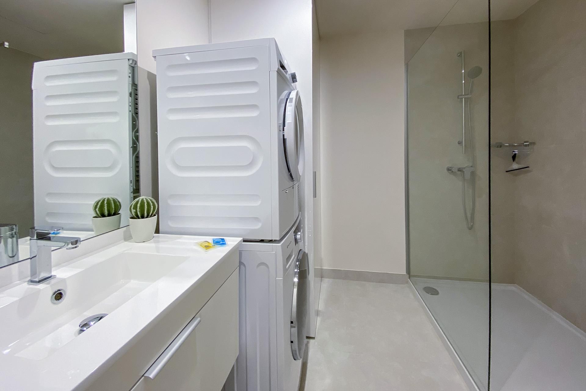 - de tweede badkamer heeft een wastafel, een inloopdouche en toilet. In de tweede badkamer staan ook de wasmachine en de wasdroger.