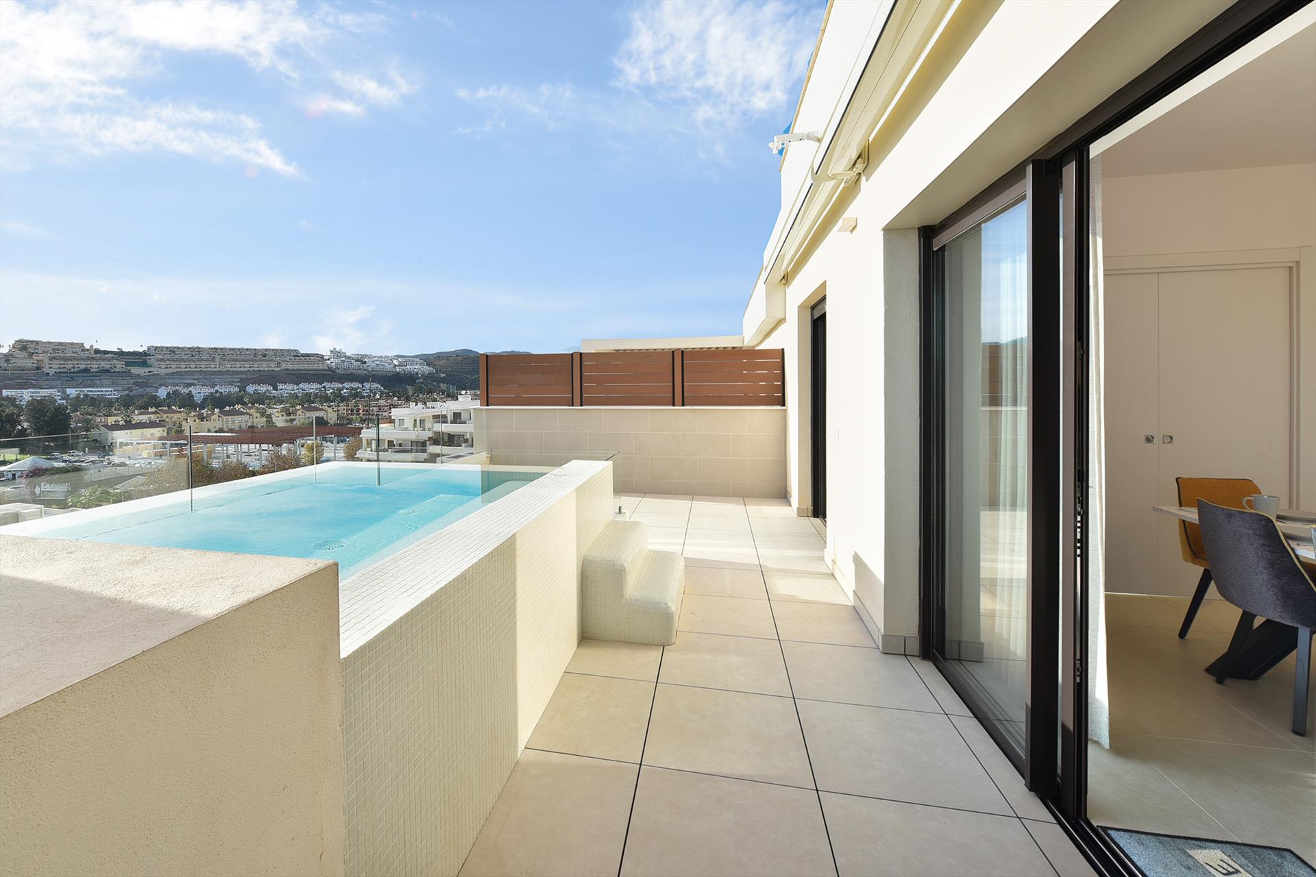 Het penthouse ligt op de derde etage van een gebouw met 3 verdiepingen. Het is stijlvol ingericht en heeft een royaal terras met eigen splash-pool waar je heerlijk kunt relaxen in de zon. Op het terras is ook een buitenkeuken aanwezig met een eettafel met 6 stoelen, comfortabele lounge meubels en twee zonnebedden. Vanaf het terras kun je genieten van het uitzicht op de omgeving en de zee en de bergen van Mijas