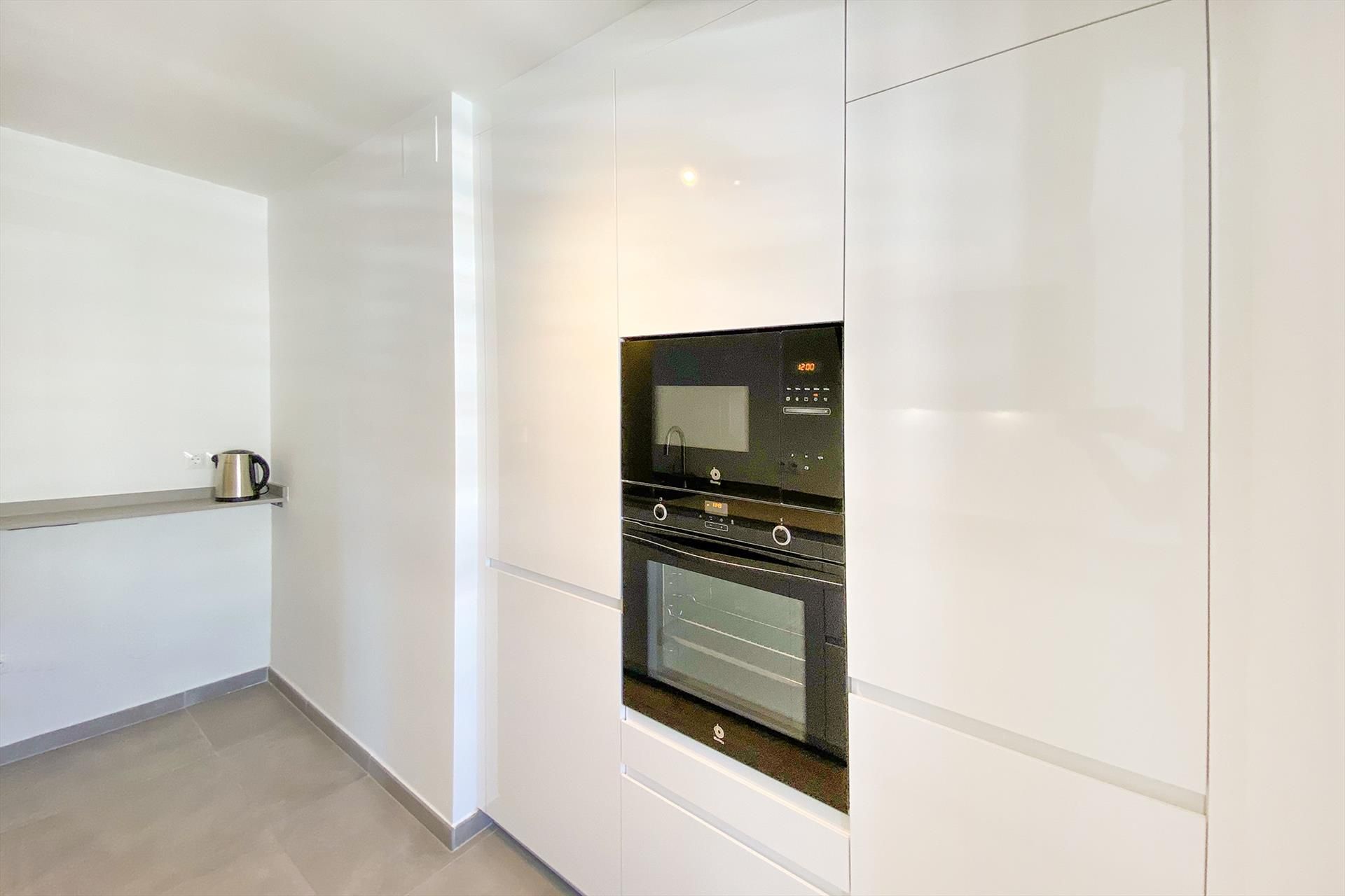 Moderne keuken. De keuken is voorzien van een inductiekookplaat, afzuigkap, oven, magnetron, koelkast, vriezer vaatwasser, koffie machine, water koker, broodtoaster.