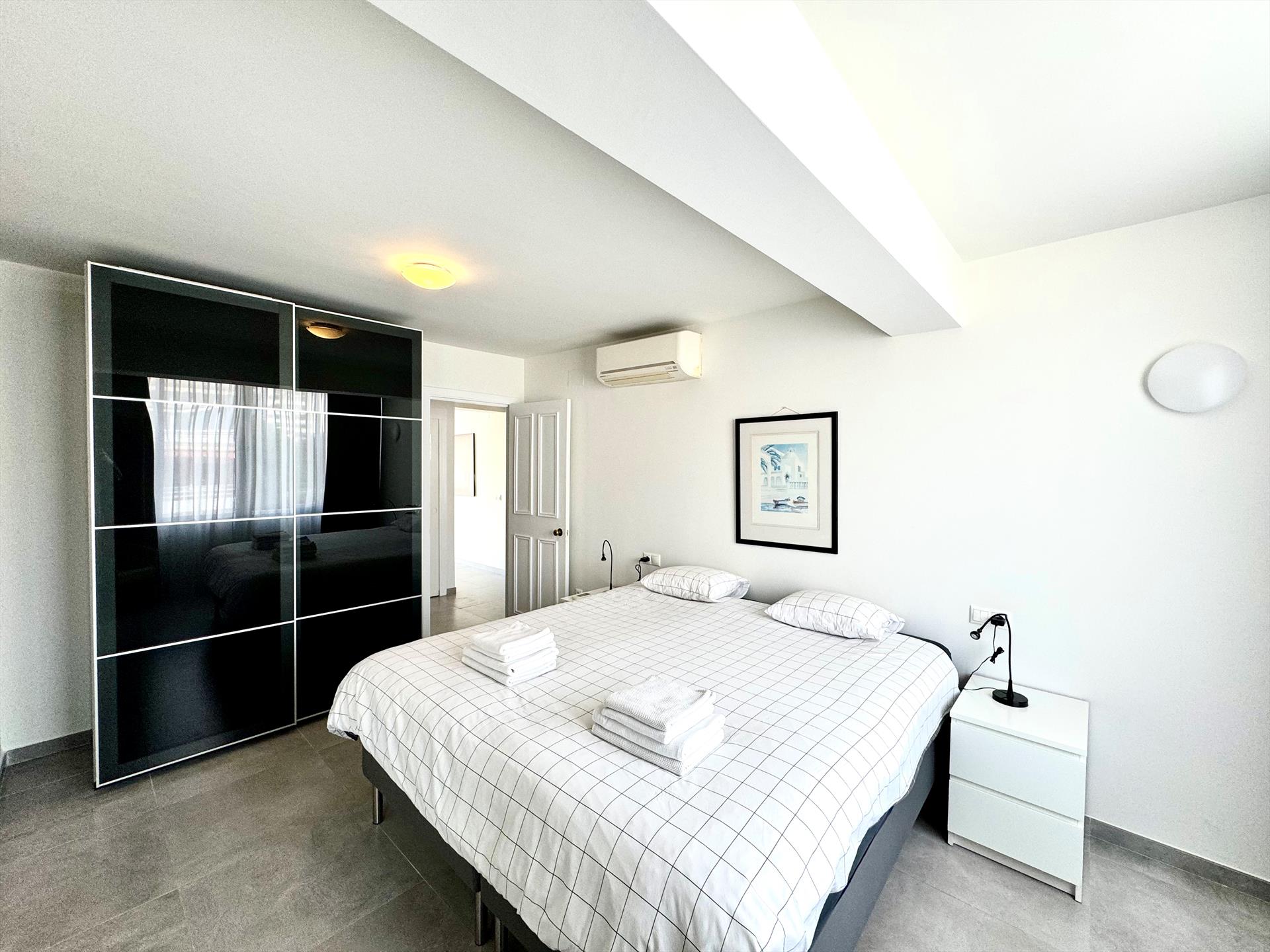 Er zijn twee slaapkamers, beide met voldoende kledingkasten en airconditioning / verwarming. De ensuite kamer heeft twee bedden van 80 X 200 tegen elkaar geplaatst en opgemaakt als 2 eenpersoons bedden met een hoogte van 60cm (seniorenbedden). De tweede slaapkamer heeft 2 eenpersoonsbedden van 90 X 200 tegen elkaar geplaats en opgemaakt als tweepersoons bed met een hoogte van 66cm (seniorenbedden).  Een babybedje en kinderstoel zijn op aanvraag beschikbaar.