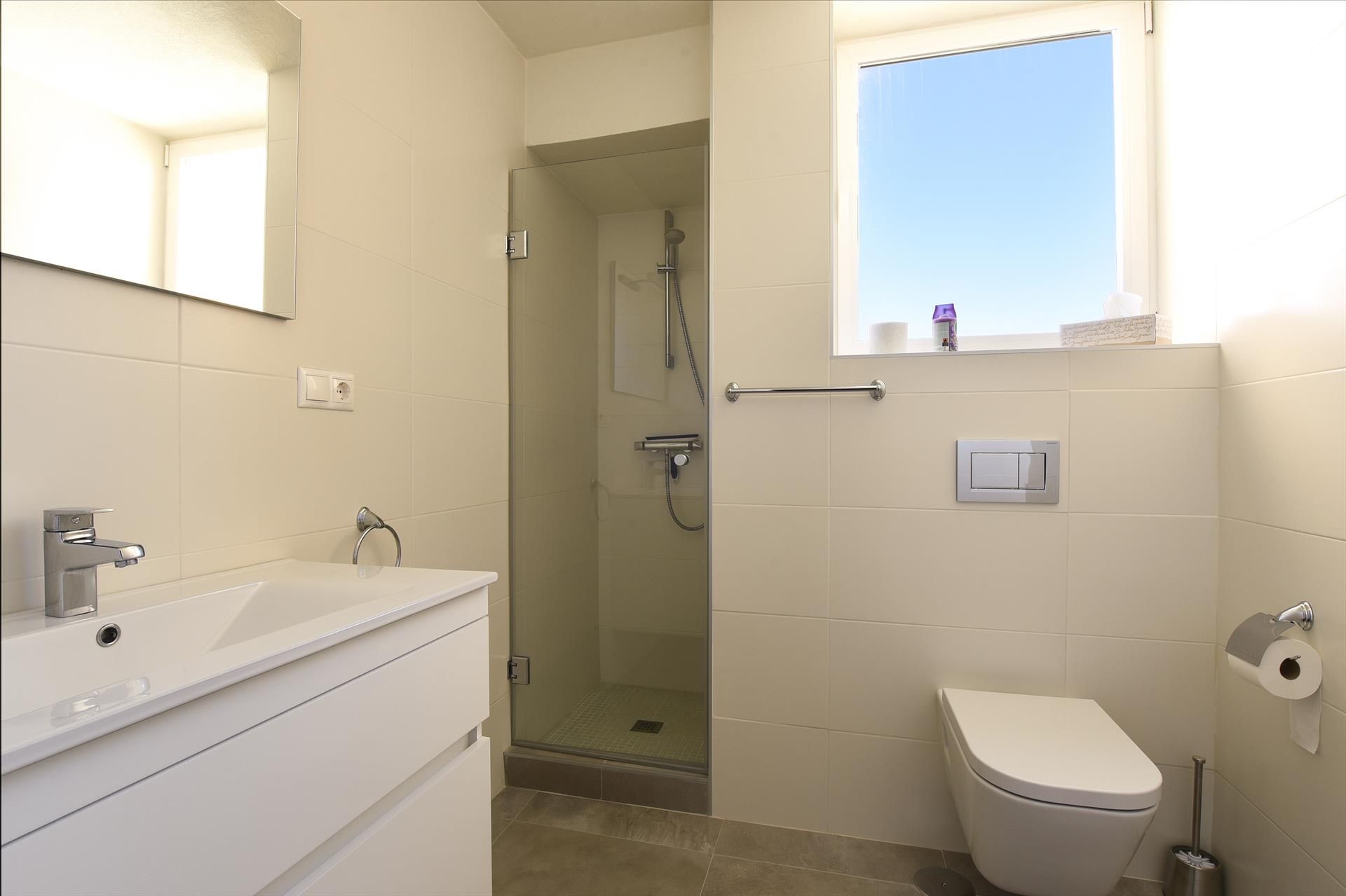 Twee badkamers. De en-suite badkamer heeft een douche, een badkamermeubel met wastafel, een toilet en een haardroger. De tweede badkamer