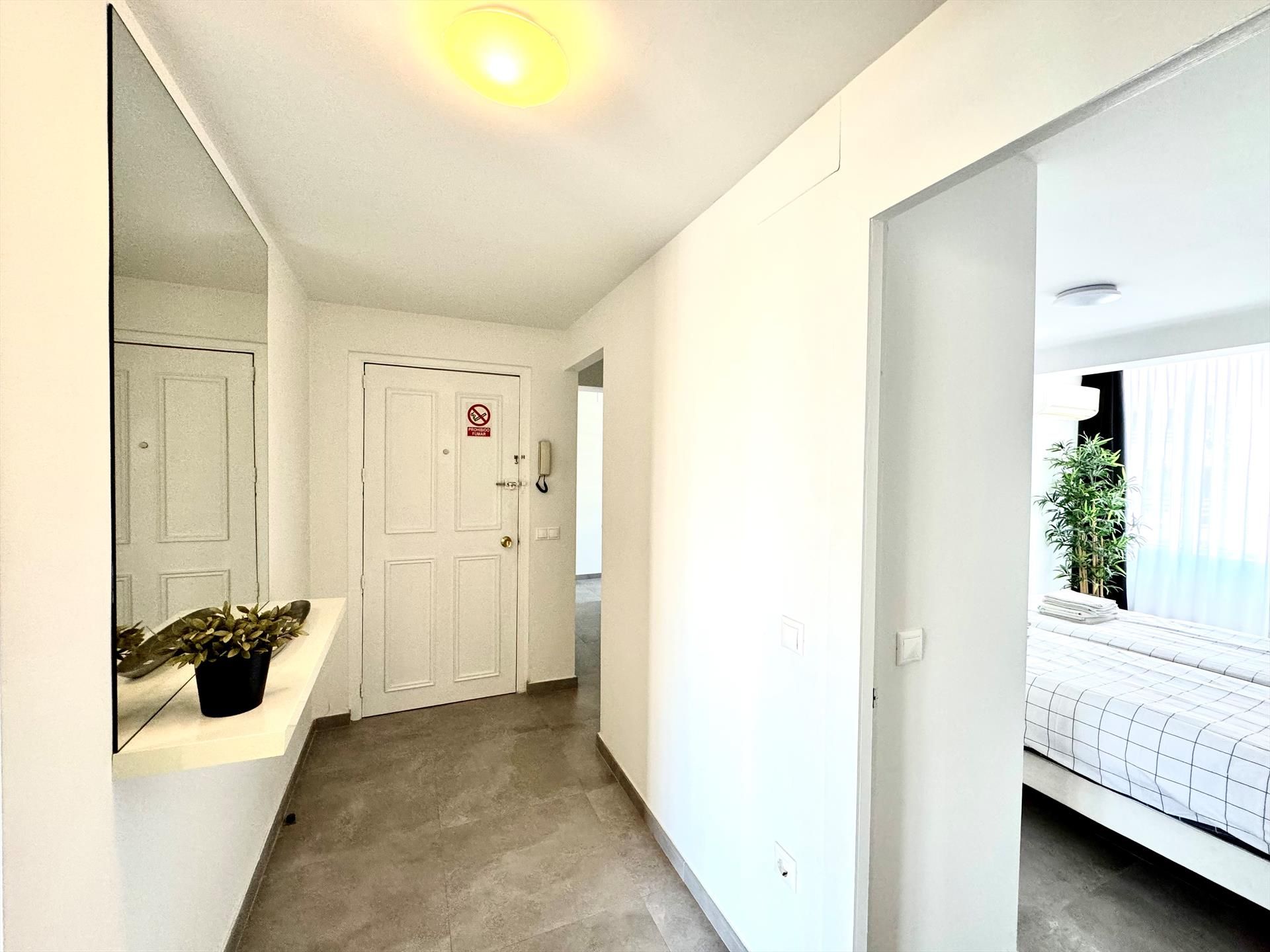 Prachtig gerenoveerd strandappartement met zeezicht, 2 slaapkamers en 2 badkamers te huur in Carihuela - Torremolinos. Door de centrale ligging met alle benodigdheden op loopafstand is dit een prachtig appartement voor een heerlijke strandvakantie in zuid Spanje. Vanuit de ruime woonkamer (met airco) en vanaf het terras kunt u genieten van het uitzicht op zee. Het mooie appartement ligt op de bovenste verdieping met lift en is zeer goed onderhouden. In de ruime woonkamer staan een lederen bank met 3 fauteuils, een eethoek met 4 stoelen en een Smart TV met Nederlandse en Vlaamse zenders, en optioneel Netflix en Videoland. Er is gratis Wifi internet via glasvezel met 300Mbps aanwezig. Het appartement heeft 2 ruime slaapkamers en twee compleet ingerichte badkamers en een overdekt terras op het zuidoosten.